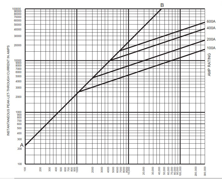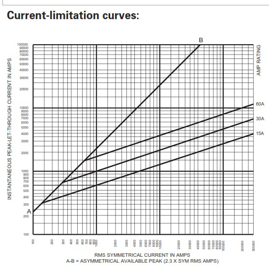 | Prospective S.C.C. | Let-Through current (apparent RMS symmetrical vs. fuse rating) | ||